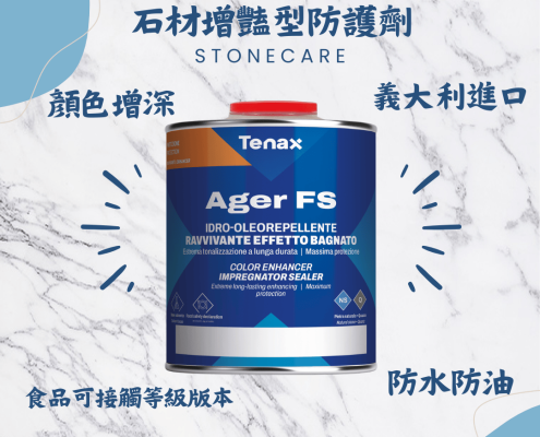 AGER FS 食品可接觸等級石材增艷型防護劑(亮面燒面皆可)。防護效期長,屬溶劑型防護劑,防水兼防油的雙重功效,施作完後表面乾燥不油膩。
